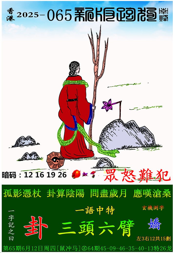 065期:新版跑狗一字記之曰【卦】 玄機測字:【嬌】