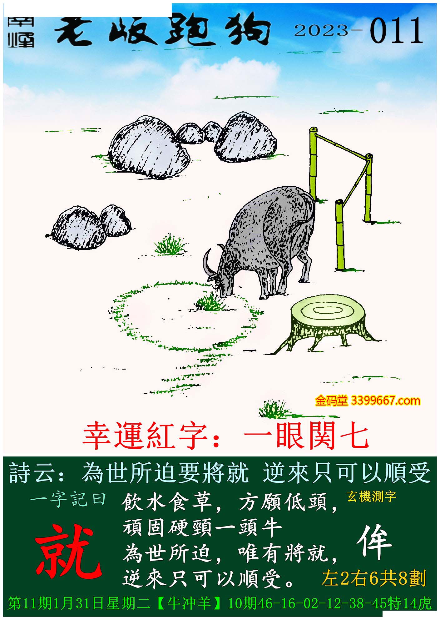 011期老版跑狗一字記之曰:【就】