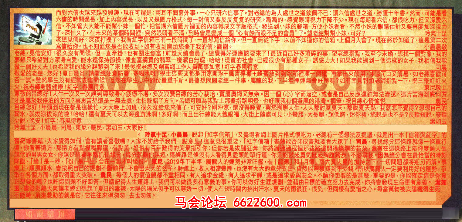 【4】尊敬的老總先生, 見信好!看六信和貼信沒十年也有八年了,大體翰多赢少,不過娛樂而以,小賭,有人說貼信三封好理解,有人說六信總結起來準,我也搞不清哪個更好,請問老總,六信需要總結歸納,還是各個分開好?有時我覺得字裡行間捉出關健字就好,例如75期貼信中有一句“你要想一下”。本想下25和14,但到最後放棄了沒有買,慚愧啊,有時候買特七上八下的不知該甚麼下,請老總指點指點該如何下才是正道。紅字如雪擊頂 --- 乘風者敬上