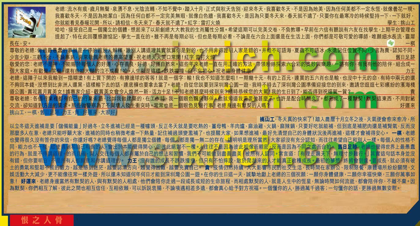 【4】.敬愛的您:老總不是神,不能賜於每個人的好運,心存善良、好德,好運自然來。這些年來老總一直在用正確的方法,帶領粉絲探索六合彩的奧妙與樂趣,一路有你,有我有他的陪伴,組合成一個大家庭。有歡聲,笑聲,還有些拍大腿的泣不成聲!哈。人生就是這樣,跌跌撞撞,但不忘初心。祝老總身體健康!  力王