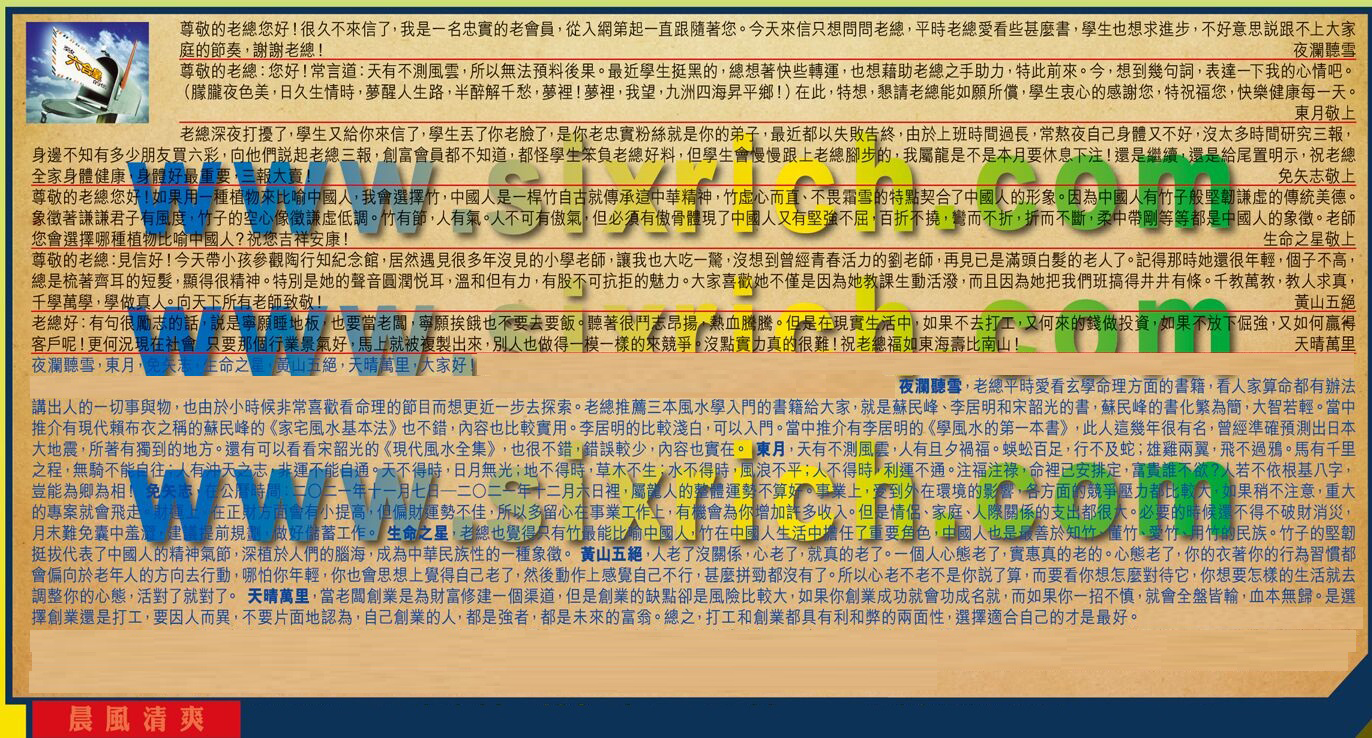 【3】.老總深夜打擾了,學生又給你來信了,學生丟了你老臉了,是你老忠實粉絲就是你的弟子,最近都以失敗告終,由於上班時間過長,常熬夜自己身體又不好,沒太多時間研究三報,身邊不知有多少朋友買六彩,向他們說起老總三報,創富會員都不知道,都怪學生笨負老總好料,但學生會慢慢跟上老總腳步的,我屬龍是不是本月要休息下注!還是繼續,還是給尾置明示,祝老總全家身體健康,身體好最重要,三報大賣!  免矢志敬上