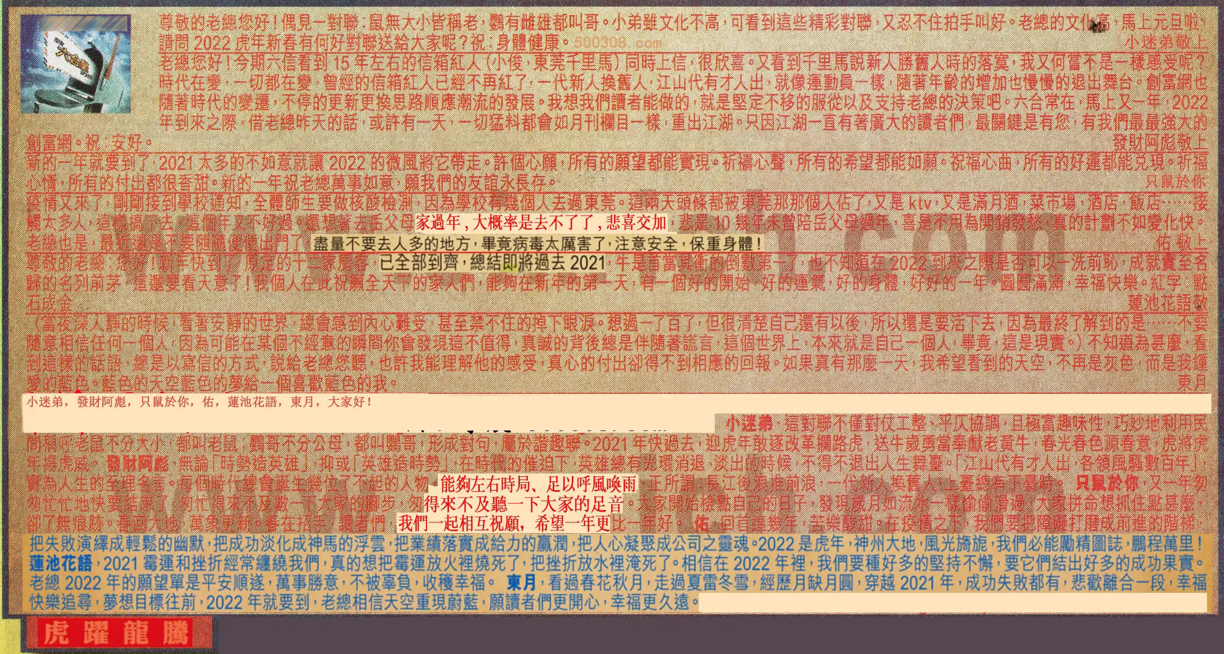 【5】. 尊敬的老總:您好!新年快到了,原定的十二家房客,已全部到齊,總結即將過去2021,牛是首當其衝的倒數第一了,也不知道在2022到來之際是否可以一洗前恥,成就實至名歸的名列前茅,這還要看天意了!我個人在此祝願全天下的家人們,能夠在新年的第一天,有一個好的開始,好的運氣,好的身體,好好的一年。圓圓滿滿,幸福快樂。紅字:點石成金  蓮池花語敬