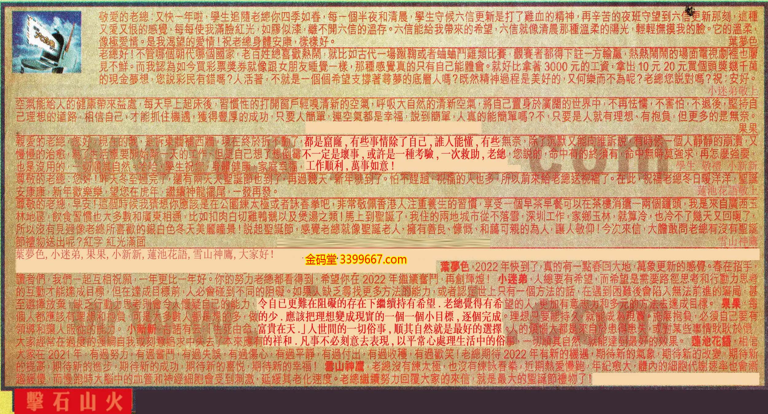 【6】. 尊敬的老總,早安!這個時候我猜想你應該是在公園練太極或者詠春拳吧,非常敬佩香港人注重養生的習慣,享受一個早茶早餐可以在茶樓消遣一兩個鐘頭,我是來自廣西玉林地區,飲食習慣也大多數和廣東相通,比如扣肉白切雞鴨鵝以及煲湯之類!馬上到聖誕了,我住的兩地城市從不落雪,深圳工作,家鄉玉林,就算冷,也冷不了幾天又回暖了,所以沒有見過像老總所喜歡的銀白色冬天美麗瞳景!説起聖誕節,感覺老總就像聖誕老人,擁有善良、慷慨、和藹可親的為人,讓人敬仰!今次來信,大膽敢問老總有沒有聖誕節禮物送出呢?紅字 紅光滿面 雪山神鹰