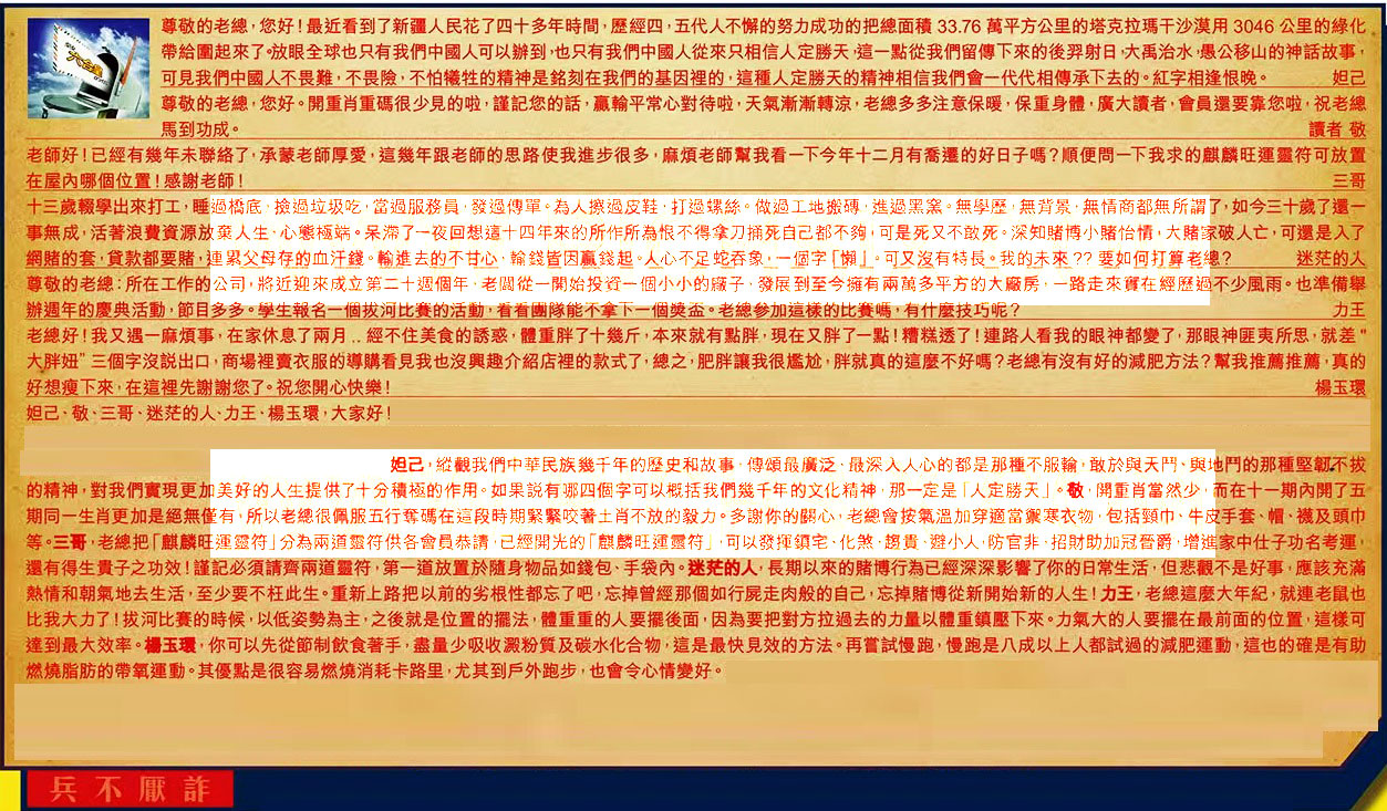 【1】.尊敬的老總,您好!最近看到了新疆人民花了四十多年時間,歷經四,五代人不懈的努力成功的把總面積33.76萬平方公里的塔克拉瑪干沙漠用3046公里的綠化,帶給圍起來了。放眼全球也只有我們中國人可以辦到,也只有我們中國人從來只相信人定勝天,這一點從我們留傳下來的後羿射日,大禹治水,愚公移山的神話故事,可見我們中國人不畏難,不畏險,不怕犧牲的精神是銘刻在我們的基因裡的,這種人定勝天的精神相信我們會一代代相傅承下去的。紅字相逢恨晚。  妲己