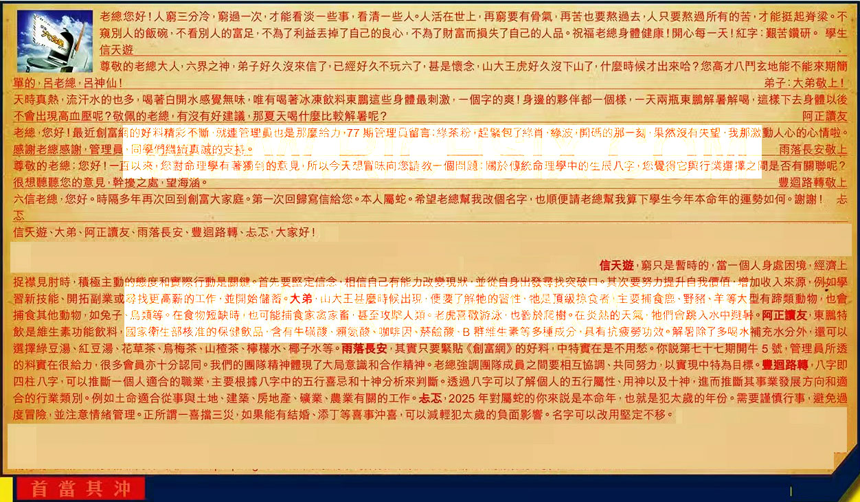 【6】.六信老總,您好。時隔多年再次回到創富大家庭。第一次回歸寫信給您。本人屬蛇。希望老總幫我改個名字,也順便請老總幫我算下學生今年本命年的運勢如何。謝謝! 忐忑