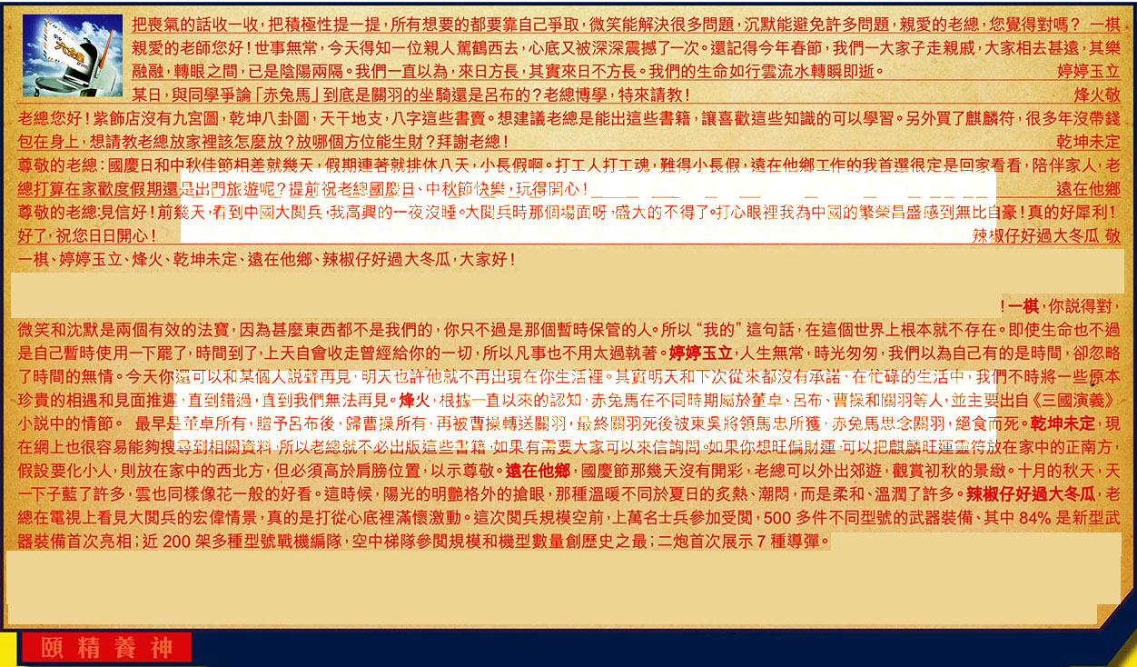 →〖辣椒仔好過大冬瓜〗:老總在電視上看見大閱兵的宏偉情景,真的是打從心底裡滿懷激動。這次閱兵規模空前,上萬名士兵參加受閱,500多件不同型號的武器裝備、其中84%是新型武器裝備首次亮相;近200架多種型號戰機編隊,空中梯隊參閱規模和機型數量創歷史之最;二炮首次展示7種導彈。