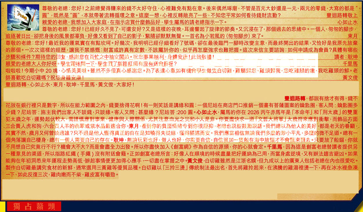 →〖千里馬〗:因為這是創富老總替讀者提供另一種意見的渠道,所以指路紅繩(手繩)沒有附送會籍。正如創富老總所言:好像人在順境的時候盡量把好運納為己用,而當身處逆境,又有辦法趨吉避凶。如果能夠在年初洞悉來年運程走勢高低,辦起事情便更加得心應手,一切盡在掌握之中。